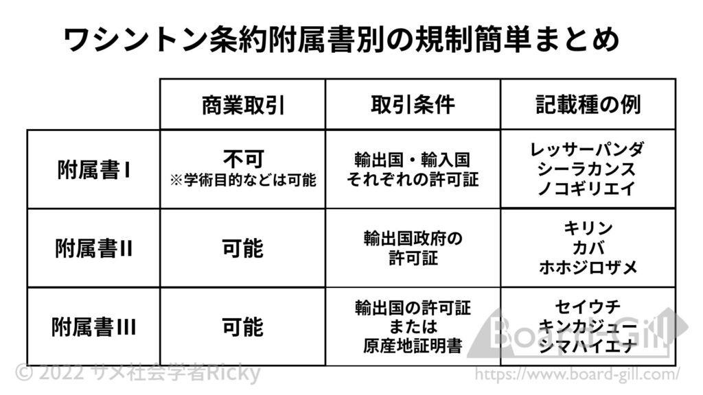 規制が必要と考えられる生物を三つの附属書(appendix)に分けてリストアップしており、附属書によって異なる規制が課されます。
