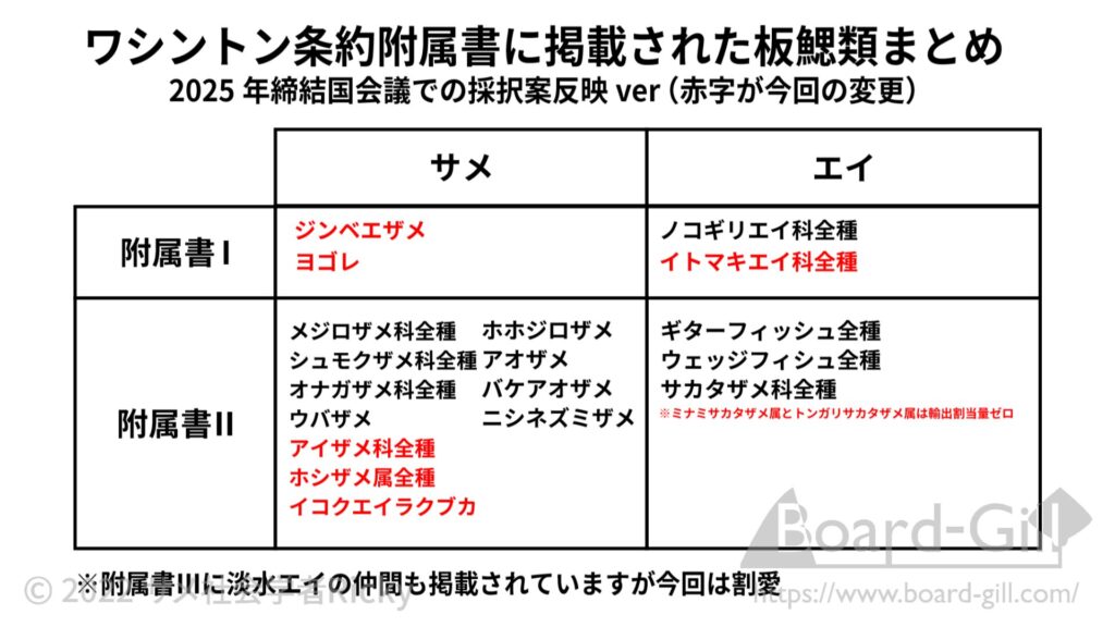以上の内容を反映した板鰓類のCITES附属書掲載状況はこのようになります。今回の採択によって、約70種以上のサメ類の取引が、新たにCITESの規制を受けることになりました。